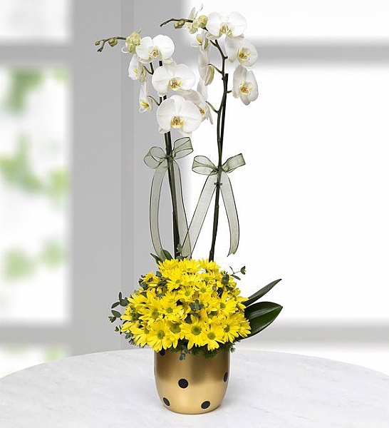 Gold Vazoda 2li Beyaz Orkide ve Sarı papatyalar