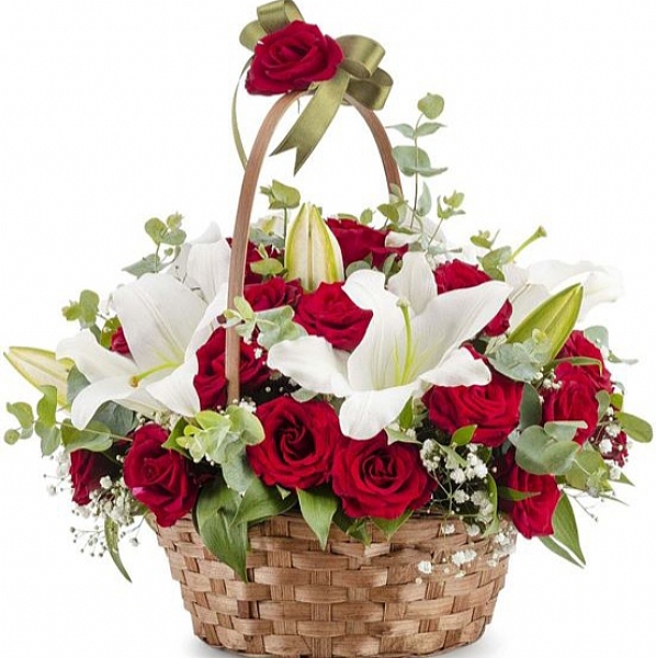 Hasır Sepette Kırmızı Güller ve Lilyumlar